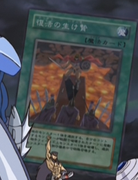 Kagemaru plays Resurrection Tribute, which can destroy any monster on the field since one of his was destroyed and Neo is destroyed. It also lets him bring back a monster in Defense Mode and he selects Hamon. (This is illegal in the CG since Hamon has a summoning method and cannot be brought out by any means except that method.) Next he uses Uria's effect to bring it back by discarding 1 Trap Card. Next he uses Phantasmal Martyrs, letting him summon 3 Phantasm tokens (0000 x4) in Attack Mode and as Bastion explains that with another Trap in the Grave, Uria's DEF rises to 2000. (The real card only gains ATK.) Finally, he tributes the tokens for Raviel, Lord of Phantasms (4000) in Attack Mode. The Sacred Beasts draw their energy and the cards fade inside shops. Some of the cards have been modified for US as shown at 9:44 into the episode (although it's hard to see).